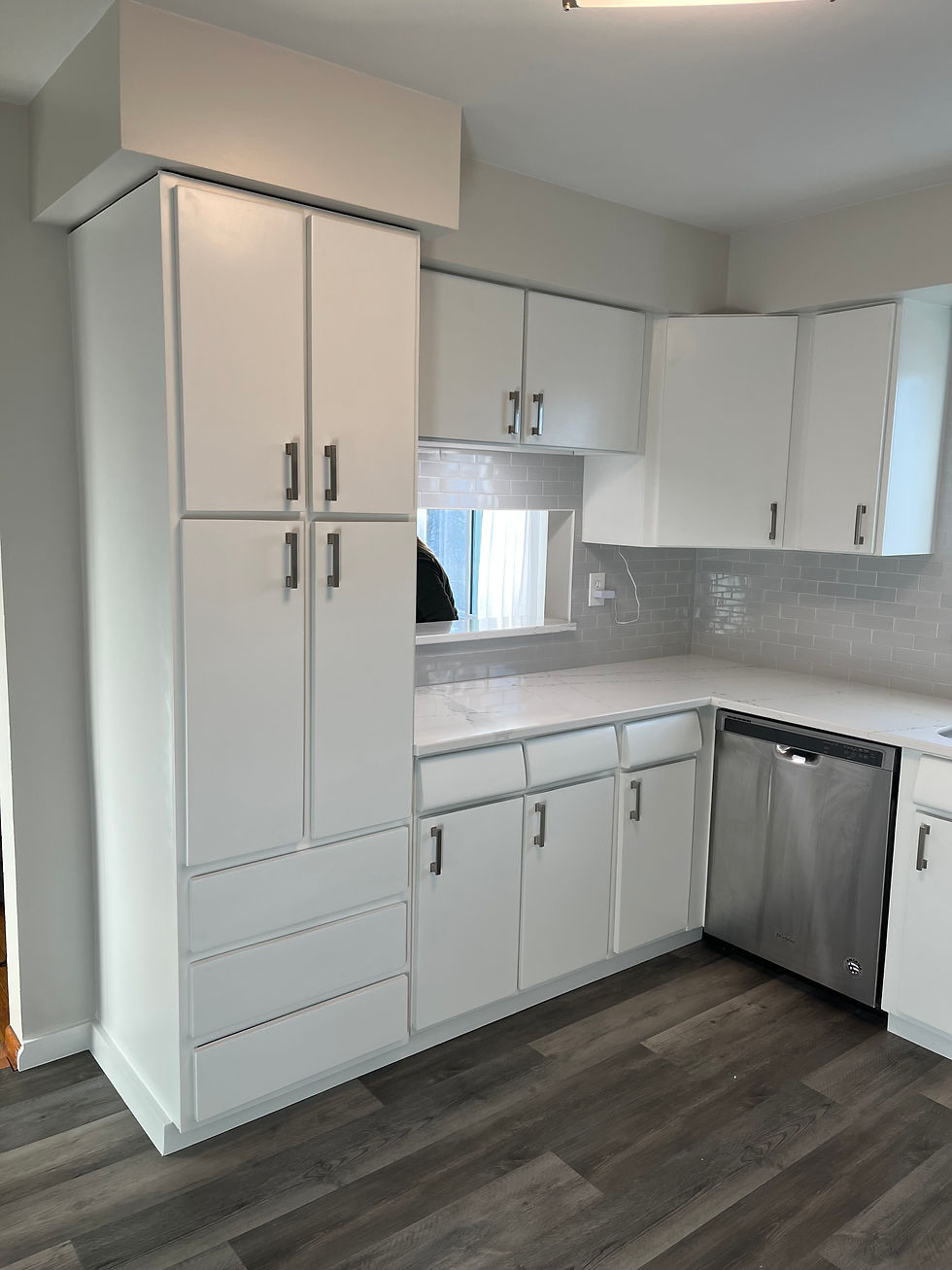 We can give old cabinets a new look with paint or stain, update and paint trim, remove old backsplash and place new tile.